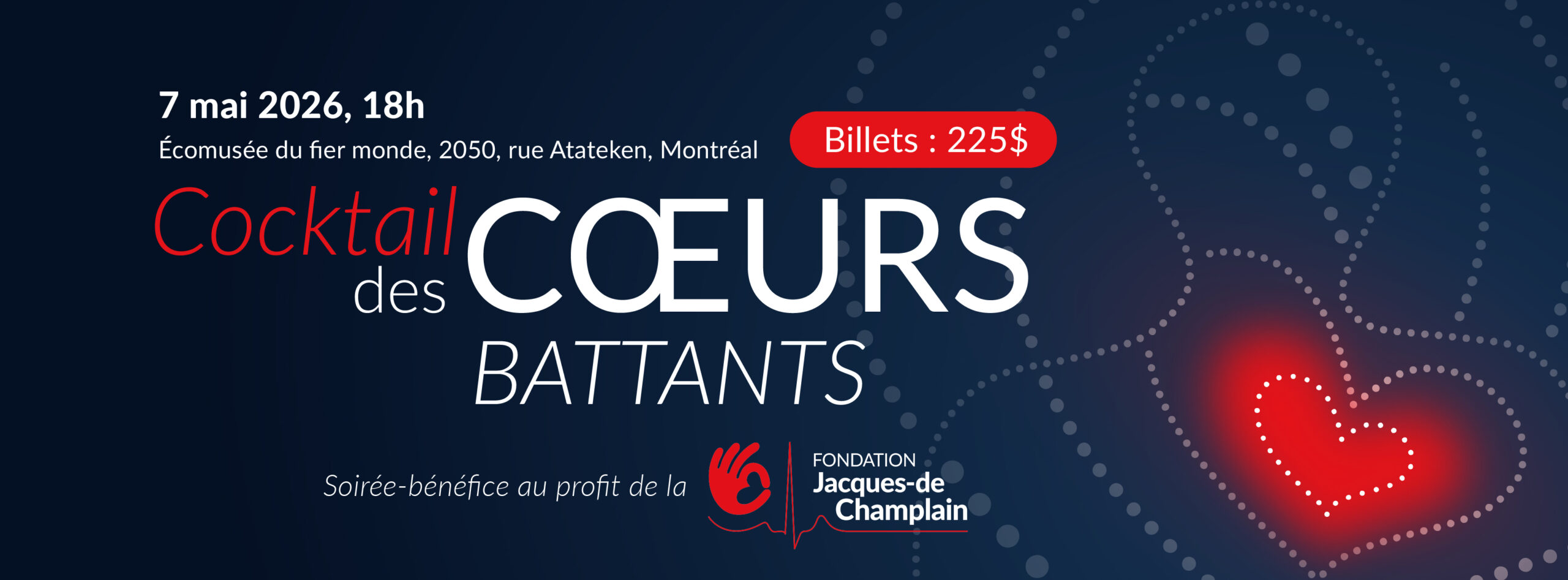 La Fondation Jacques-de Champlain vous invite à la 3e édition du Cocktail des Cœurs Battants, un cocktail dînatoire avec une mission vitale: sauver des vies en rendant les défibrillateurs externes automatisés (DEA) accessibles partout au Québec.